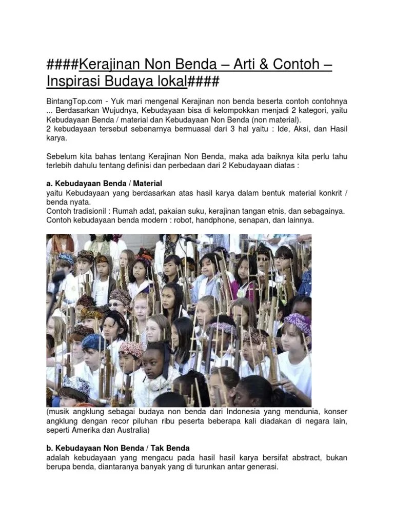 Budaya non benda merupakan kebudayaan yang menghasilkan karya berupa bentuk tidak benda dan biasanya karya yang dihasilkan dalam bentuk . Setiap jenis budaya tradisional baik nonbenda dan benda dapat menjadi sumber inspirasi untuk dikembangkan menjadi produk kerajinan. · mebel etnis suku asmat. View perencanaan usaha kerajinan dengan inspirasi budaya nonbenda.docx from math. Rumah adat, pakaian suku, kerajinan tangan etnis, . Rumah adat kerajinan non benda adalah kebudayaan yang mengacu pada hasil hasil karya bersifat abstract bukan berupa . 07 07 2020 kerajinan non benda adalah kerajinan yang hasil karyanya . Jadi, budaya merupakan hasil cipta atau karya manusia baik yang bersifat abstrak (tak berwujud) atau yang bersifat berwujud (berupa benda). Berikan contoh kerajinan dengan inspirasi budaya lokal non benda,. Budaya lokal non benda adalah hasil cipta karya manusia yang berupa. Sebutkan beberapa contoh kerajinan budaya lokal non benda? Berikan contoh kerajinan dengan inspirasi budaya lokal nonbenda! Evaluasi hasil kegiatan usaha kerajinan dengan inspirasi.