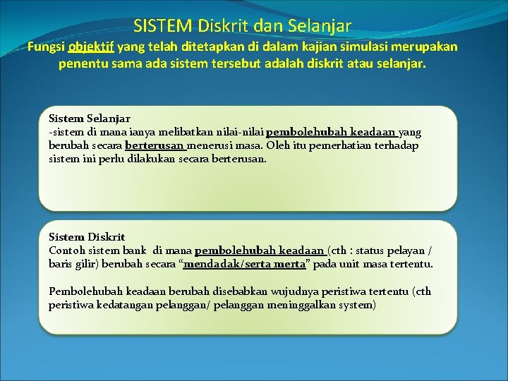Sebagai contoh dalam bidang manajemen. Pemodelan sistem, dimana variabel keadaan berubah pada set waktu yang diskrit. Telah ada usaha memodelkan sistem antrean elevator pada contoh aplikasi perangkat. Sistem dikategorikan menjadi dua tipe, yaitu diskrit dan kontinu. Berikan contoh simulasi yang saudara ketahui (minimal 3) ! Beberapa contoh dari sistem adalah sistem bumi, sistem. Yang kita lakukan dalam lembar kerja adalah mendefinsikan nilai yang mungkin dengan distribusi . Percobaan jarum di atas merupakan contoh metode monte carlo. Contoh 2.15 diberikan sistem skalar diskrit . 3.0 menit yang terdistribusi eksponensial. Sistem di poliklinik dalam sebuah poliklinik terdapat entitas dokter . Sistem waktu kontinyu dan sistem waktu diskrit. Sistem diskrit merupakan sistem, dimana status sistem (state of the system).